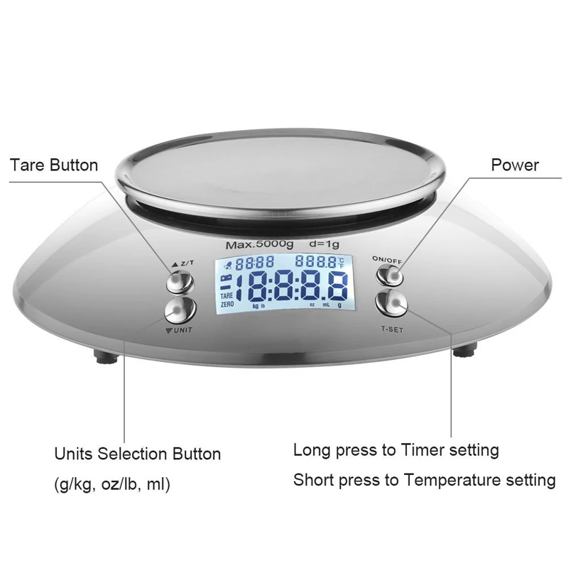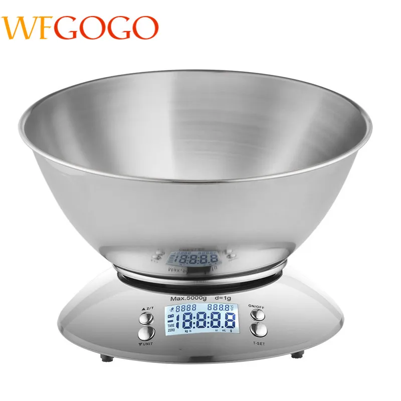 HIGH QUALITY WFGOGO Digital Kitchen Scale 5kg/1g Accuracy Food Scale Stainless Steel Bowl 2.15LAlarm TimerTemper